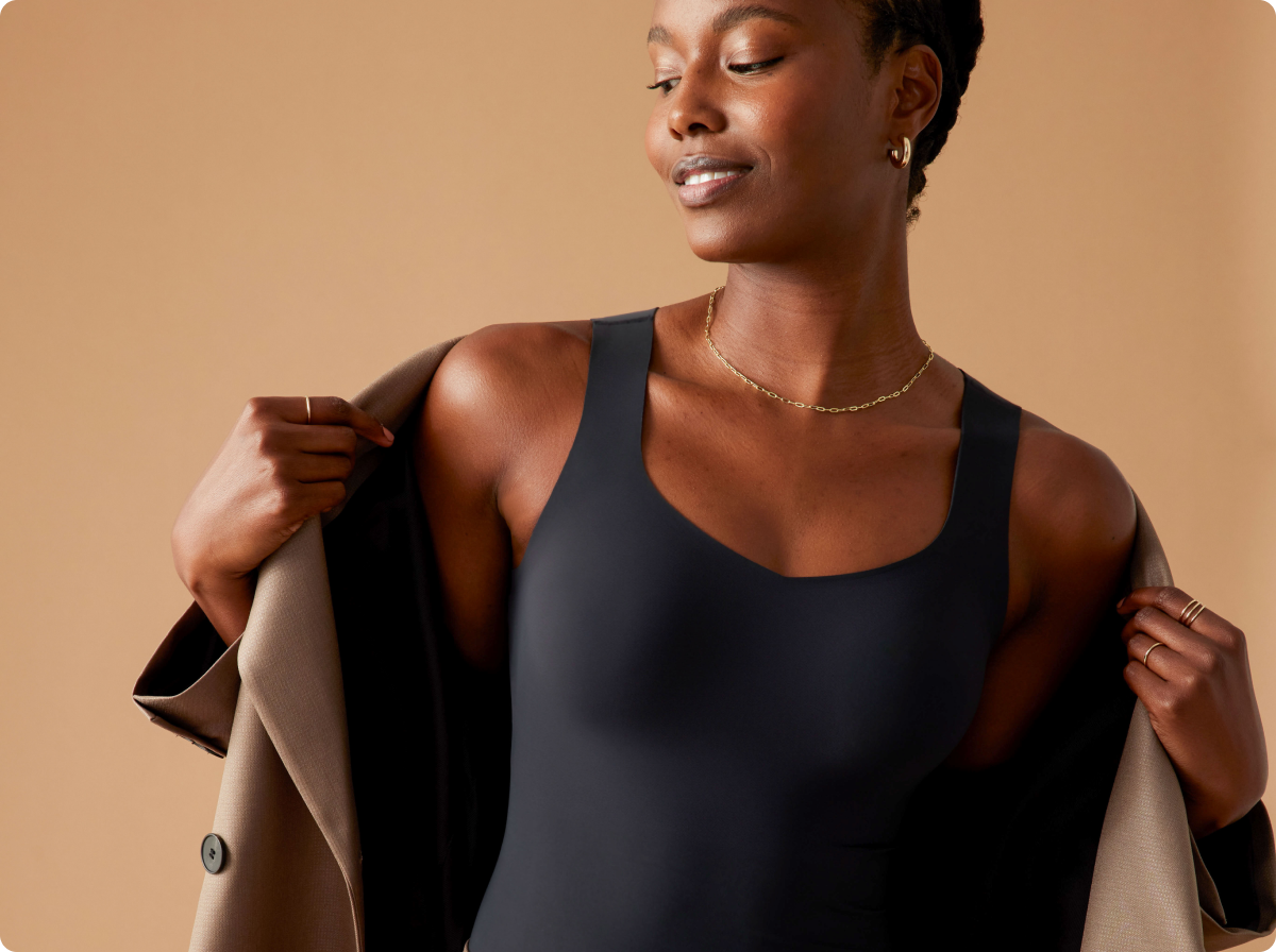 The Defy Bra, seamlessly extended into a smoothing ‘tuck-in’ tank, providing effective pain relief and tummy smoothing.